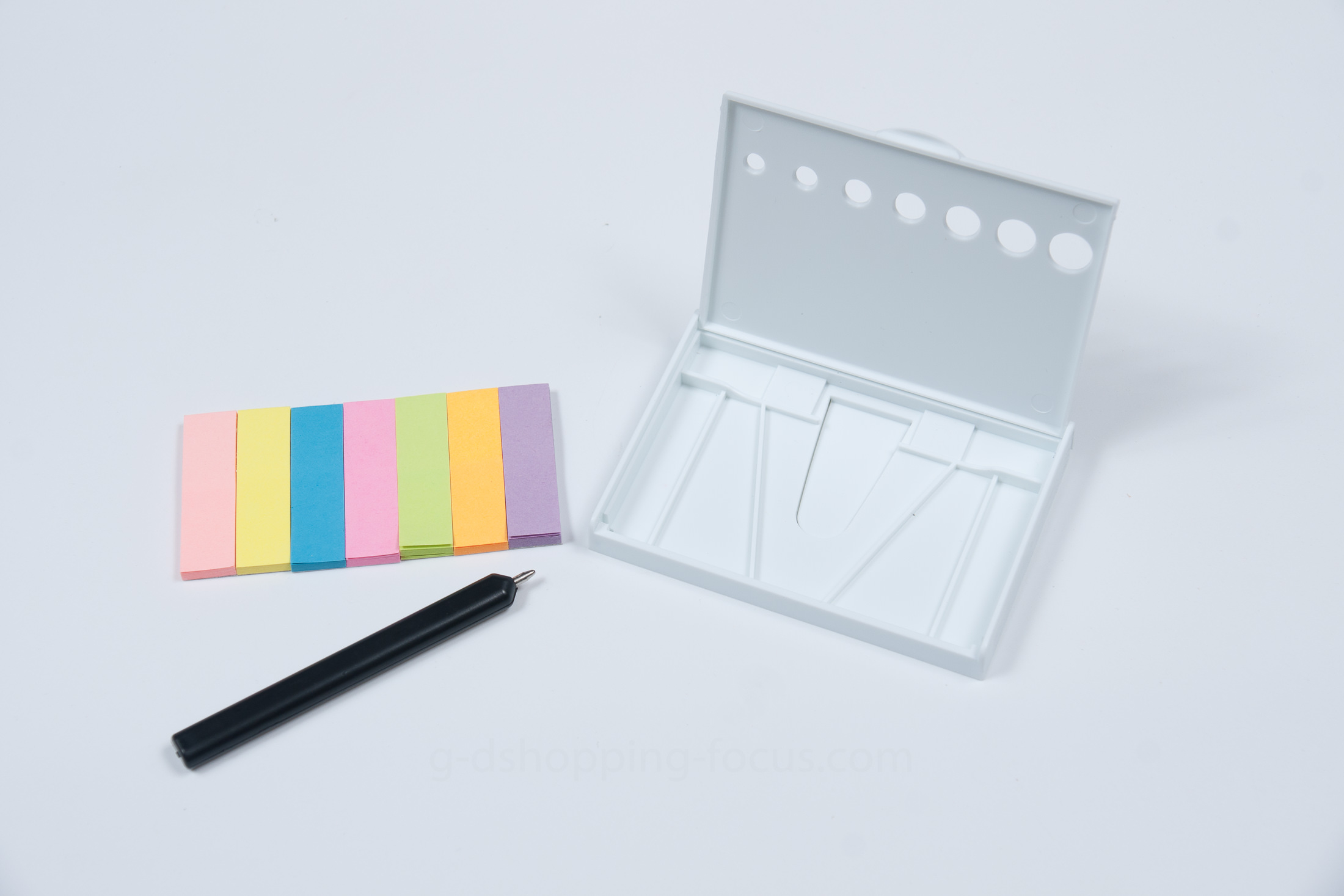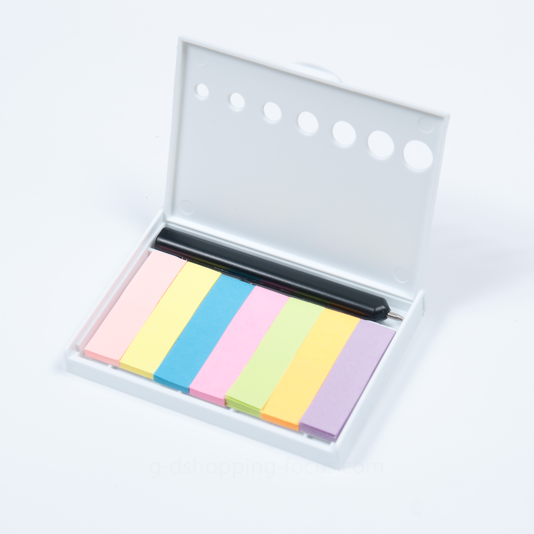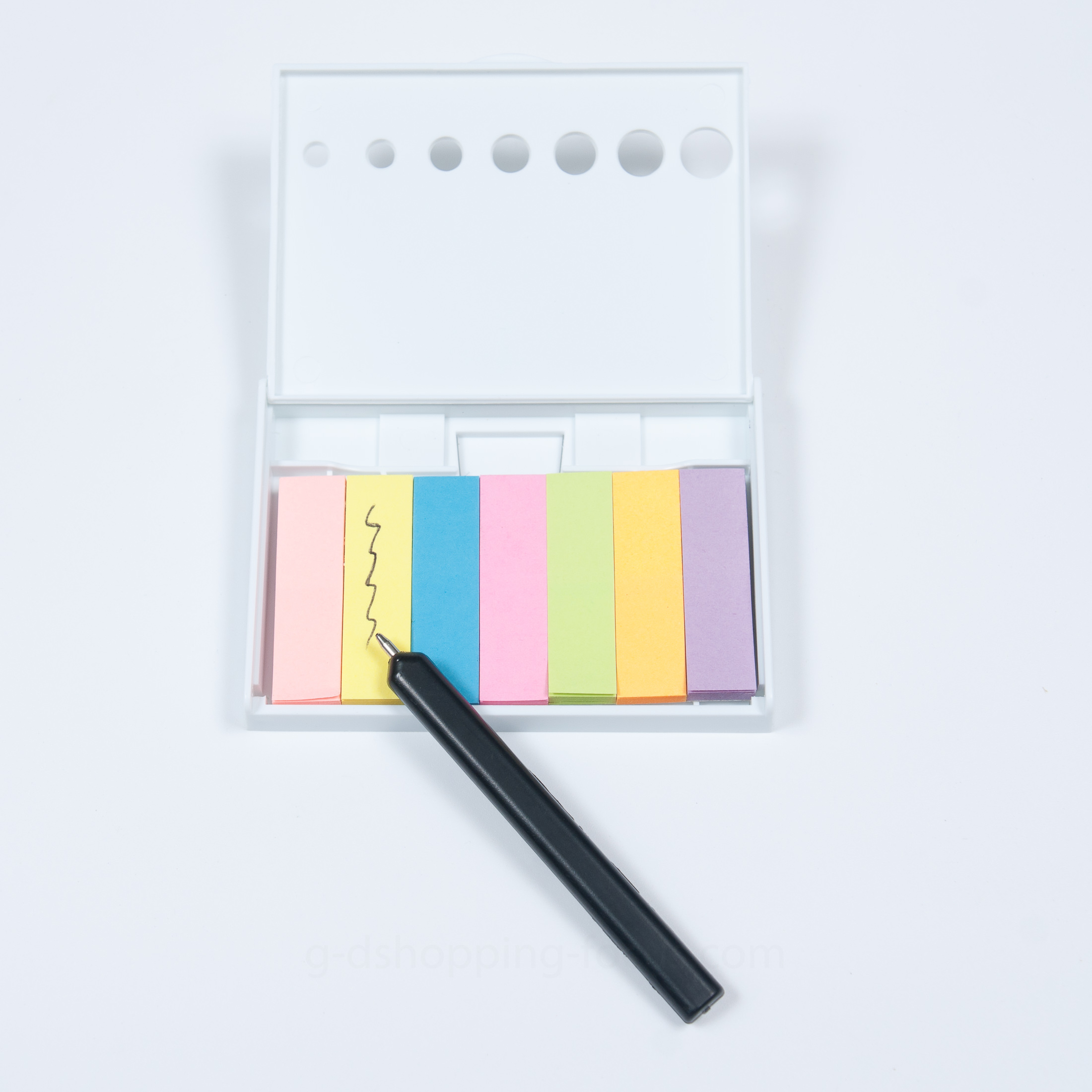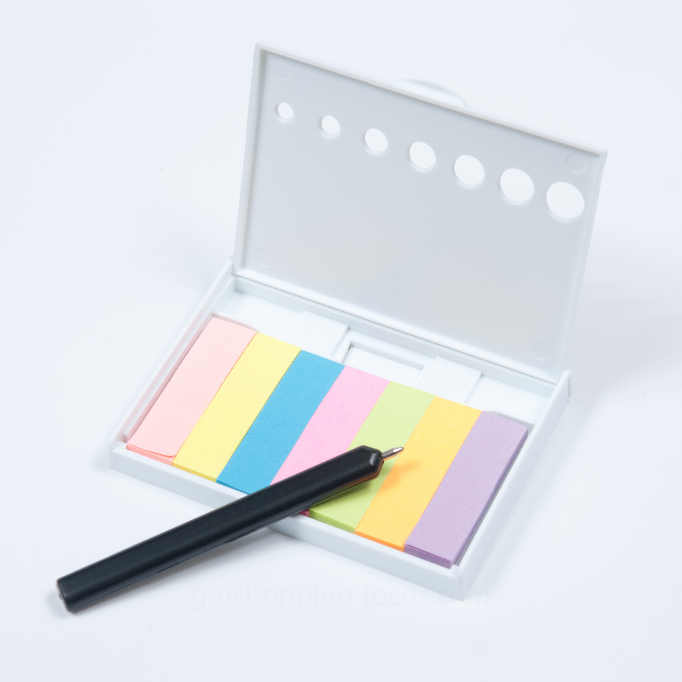 尺寸:9.2X6.5X1.3公分包裝:OPP袋裝筆芯:黑芯便利貼:粉紅、黃、藍、桃紅、綠、橘、紫共七色